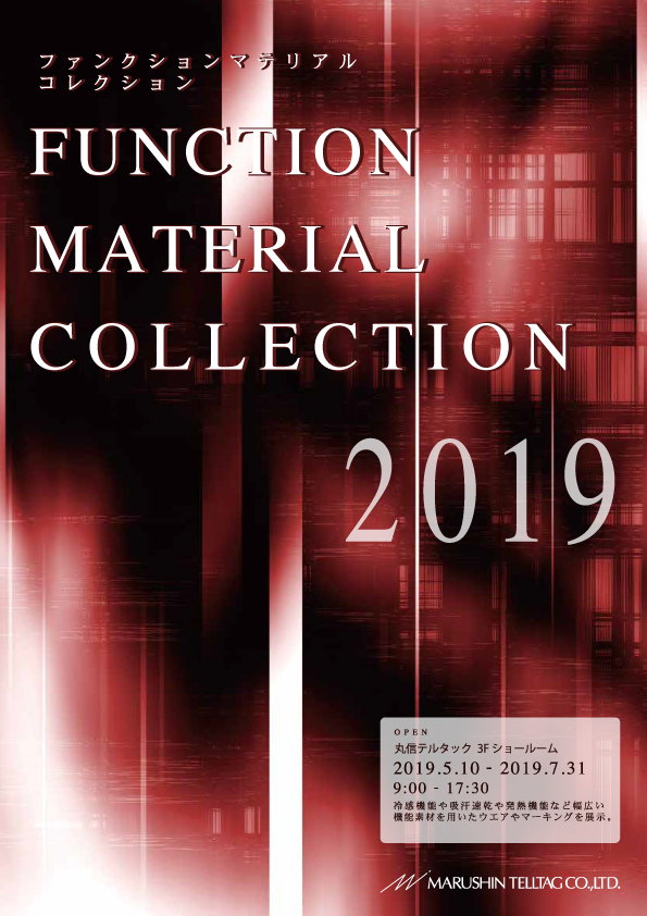 FUNCTION MATERIAL COLLECTION 2019.05.15NEWS FUNCTION MATERIAL COLLECTION 2019.5.10-2019.7.31 9:00-17:30 冷感機能や吸汗速乾や発熱機能など 幅広い機能素材を用いたウェアやマーキングを展示。